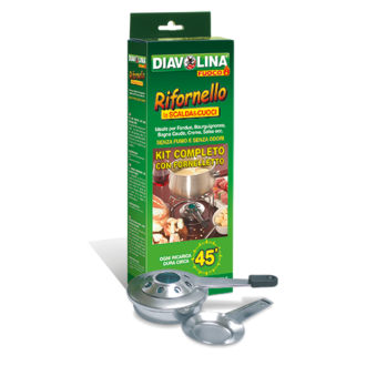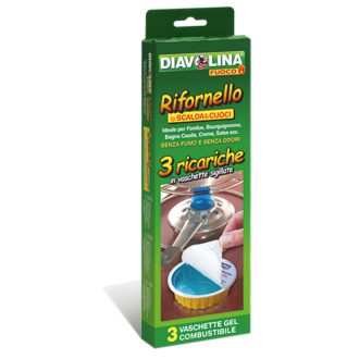 Rifornello Gel è il gel scaldavivande di Diavolina per cucinare fondue, bourguignonne, bagna cauda e riscaldare creme, salse. 3 vaschette sigillate di gel, fornite con il fornelletto in